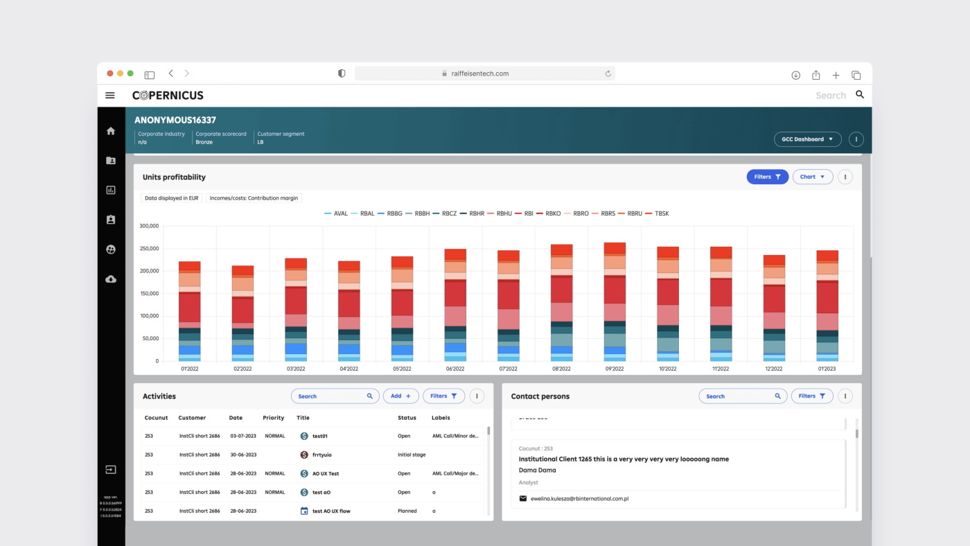 We have developed a custom CRM solution designed to empower account managers, product managers, and other professionals to engage with customers in the Financial Institutions and Corporate segment. Our primary focus lies in delivering a comprehensive 360-degree customer view, where users can effortlessly access all relevant data from banking systems, external sources, and their inputs. This holistic perspective includes planned transactions, customer contacts, and relationship development plans. Moreover, our reporting layer streamlines data aggregation, facilitating efficient sales team management.
